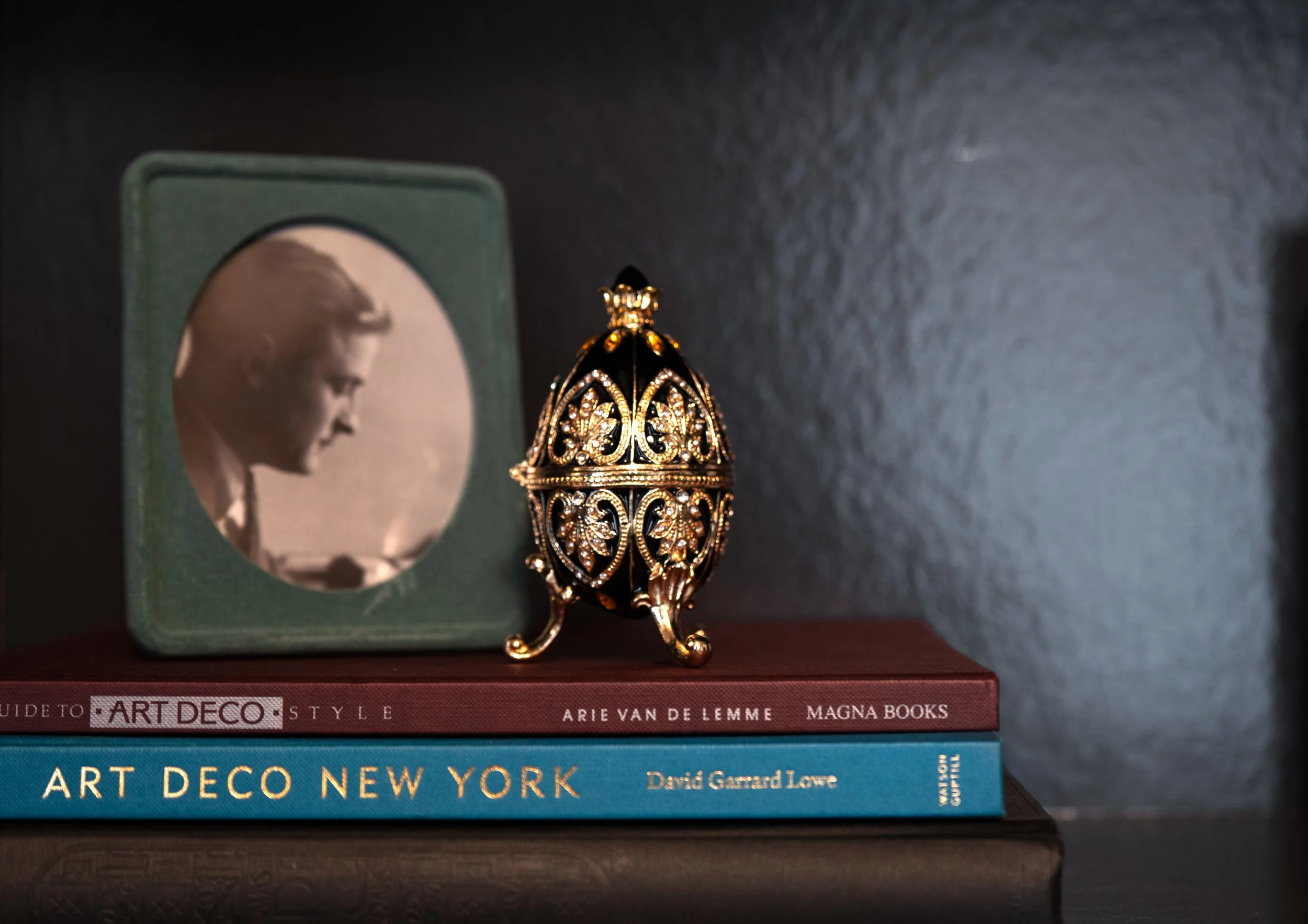 A photo of Scott Fitzgerald and a symbol of his aspirational East Egg in the Great Gatsby Suite